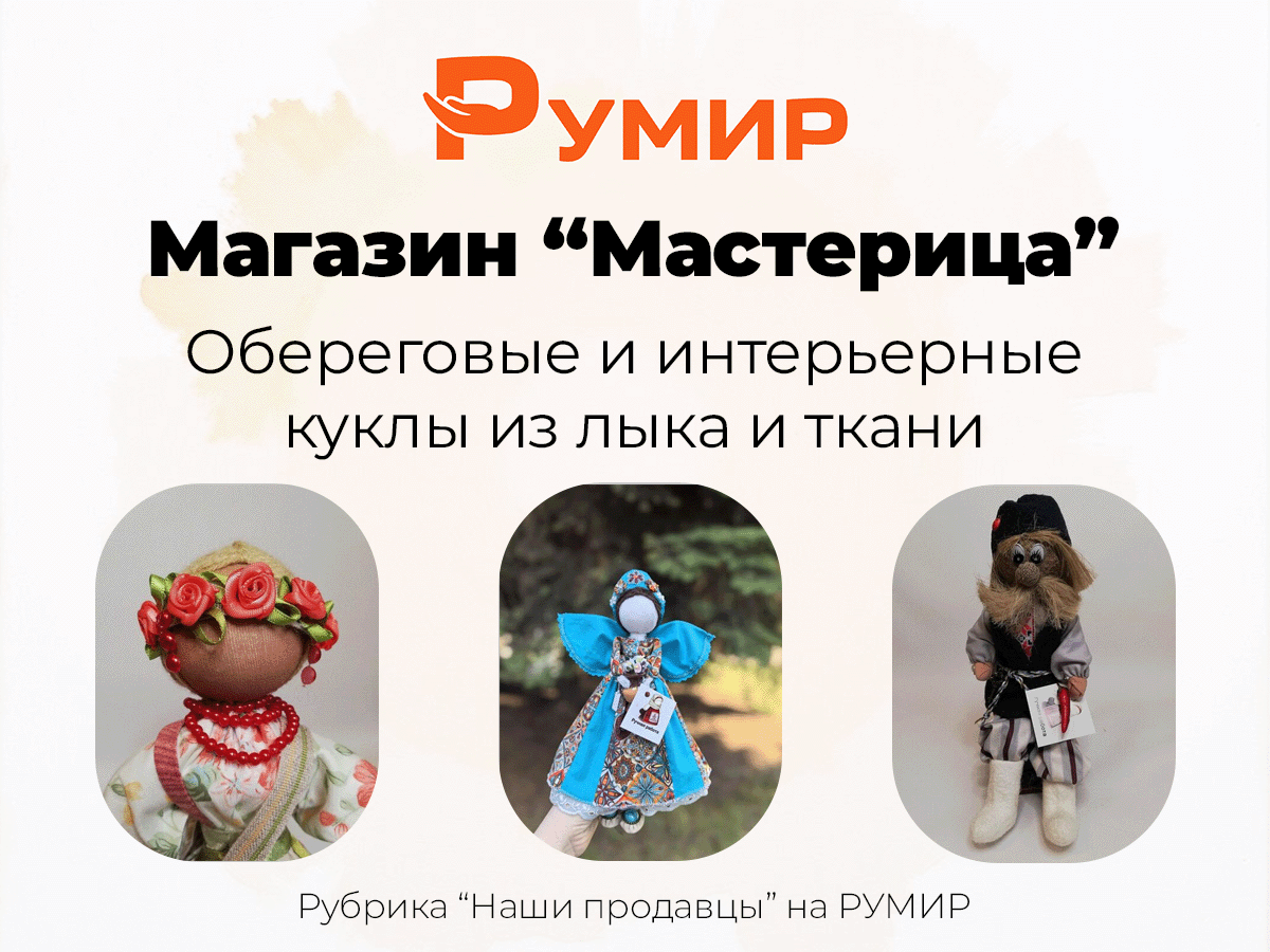Магазин «Мастерица» на РУМИР — это авторские обереговые и интерьерные куклы из натуральных материалов. Никакой синтетики, только ткань и лыко.