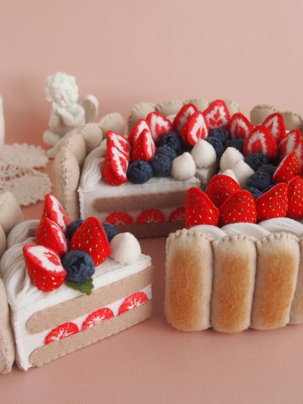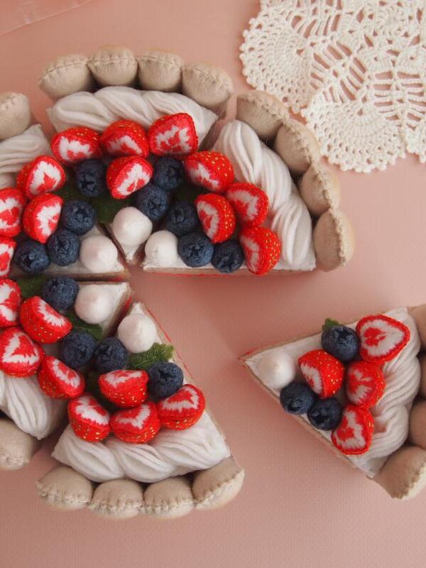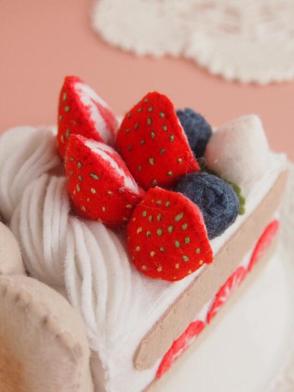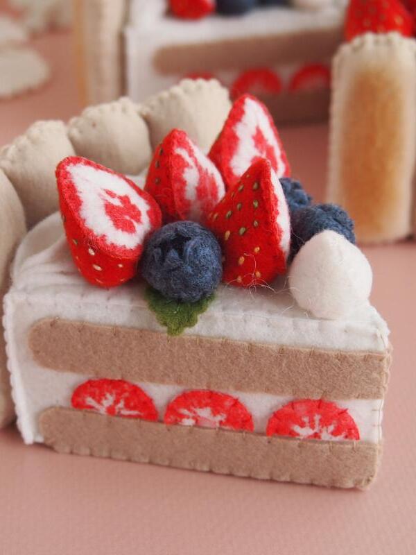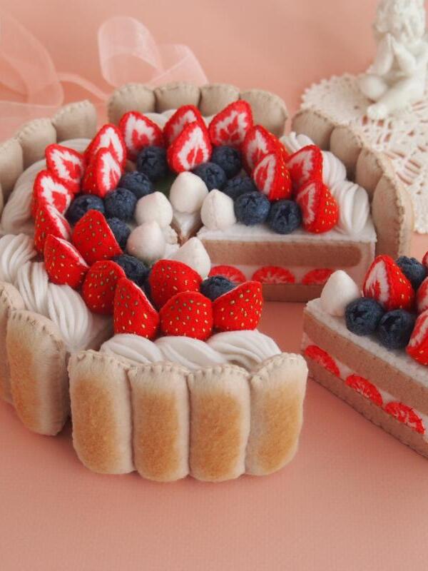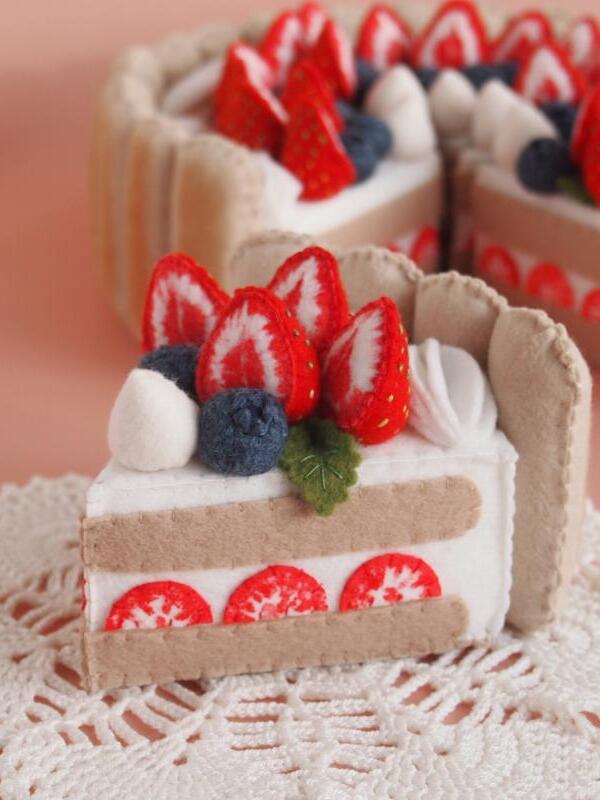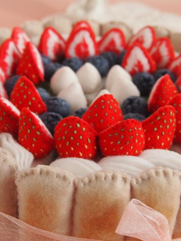 Торт сшит полностью вручную из материалов высокого качества. Внутри торта поролон, он держит форму, легкий и безопасный для детей. Косточки на клубнике вышиты вручную, ягоды окрашены акриловой краской для ткани.