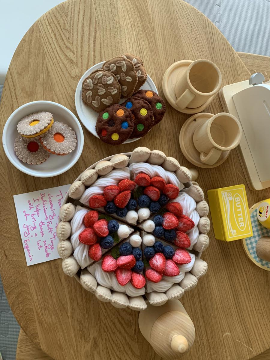 Подарочный торт из фетра с печеньем и клубникой является полноценной игрушкой для сюжетно-ролевой игры: кафе, День рождения, прием гостей, магазин, дочки-матери. Он станет прекрасным подарком на день рождения ребенку и приятно его удивит, украсит детскую комнату или фотосессию.